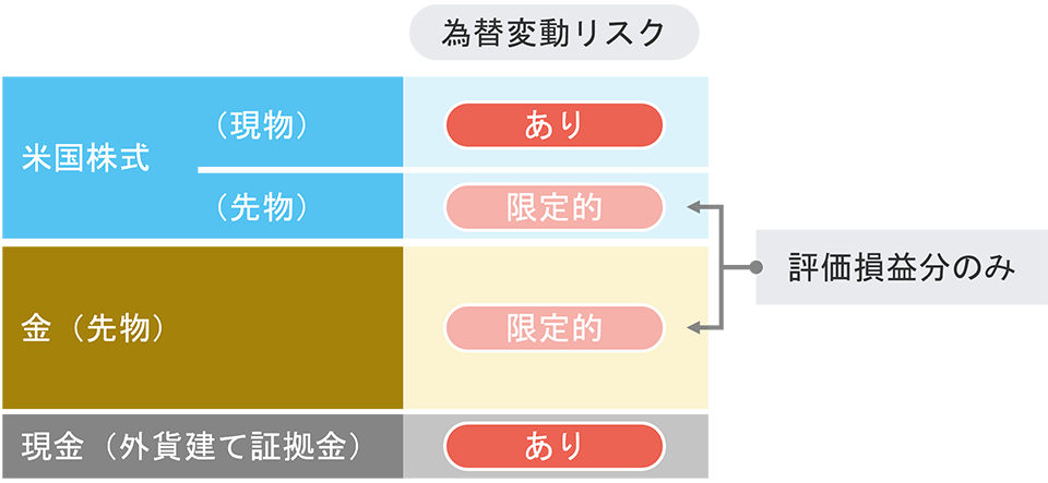 海外株式、世界の株価指数先物取引(評価損益分を含む)および外貨建て証拠金など保有する外貨については、為替変動の影響を受けます。金先物取引においては、買建額に対する為替変動の影響がなく、為替変動の影響を受けるのは主に評価損益分と外貨建て証拠金となります。 金先物取引に投資する場合、先物取引の仕組みにより為替変動の影響が限定的であることから、為替が円安となる局面での為替差益も限定的となります。実際の運用は、純資産総額の合計が200%とならない場合があります。