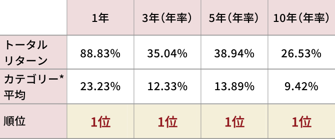 野村世界業種別投資シリーズ(世界半導体株投資)は、ウエルスアドバイザーのカテゴリー「国際株式・グローバル・含む日本(為替ヘッジなし)」の中で、トータルリターンランキング1位を総なめにしている高パフォーマンスのファンドです。