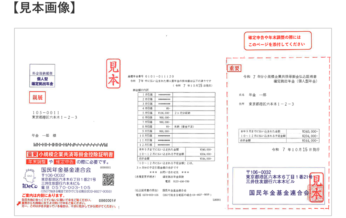 iDeCoの加入者(掛金の拠出がある方)で個人の口座から掛金の引き落としをされている方には、国民年金基金連合会から「小規模企業共済等掛金払込証明書(以下、払込証明書)」が葉書タイプ(圧着葉書)の転送可能な普通郵便で発送されます。