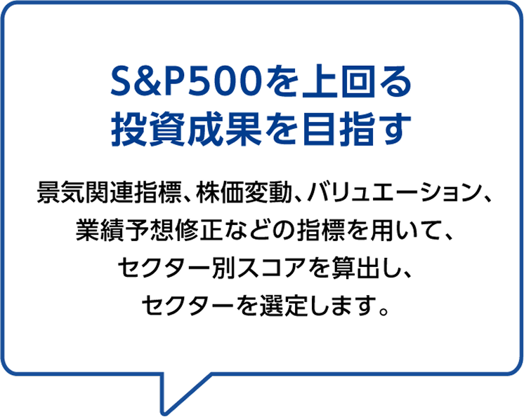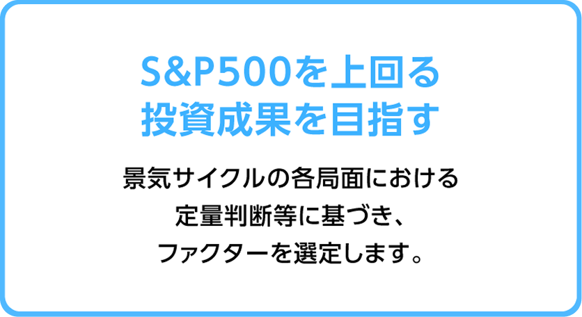 株ラップは、経済や金利などのマクロ的視点から分析し、業種やファクター、国・地域の配分を決めるトップダウン・アプローチを採用しています。三井住友DSアセットマネジメント独自の運用戦略を活用することで、中長期的に世界株式(配当を含み、円換算ベース)を上回るリターンを目指します。
