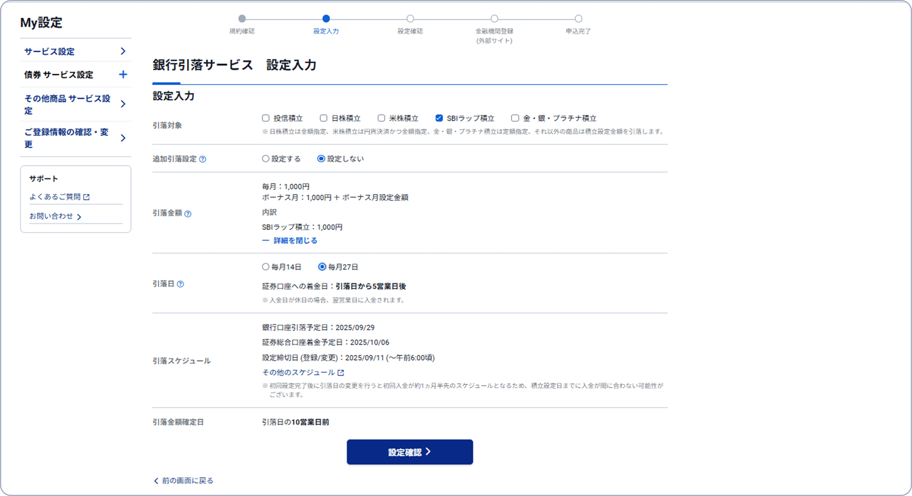 銀行引落サービスの設定入力画面で、引落対象として「SBIラップ積立」を選択ください。