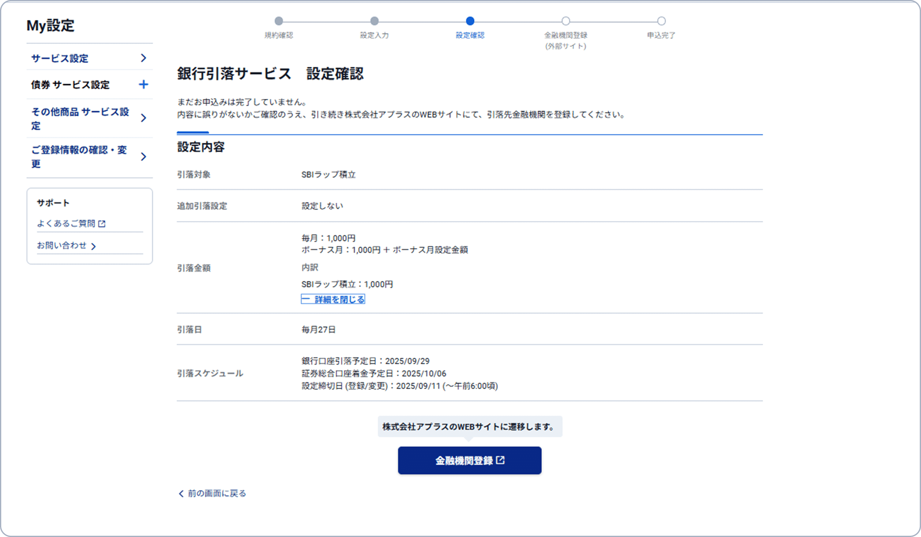 本画面が表示されれば積立設定の申込完了です。