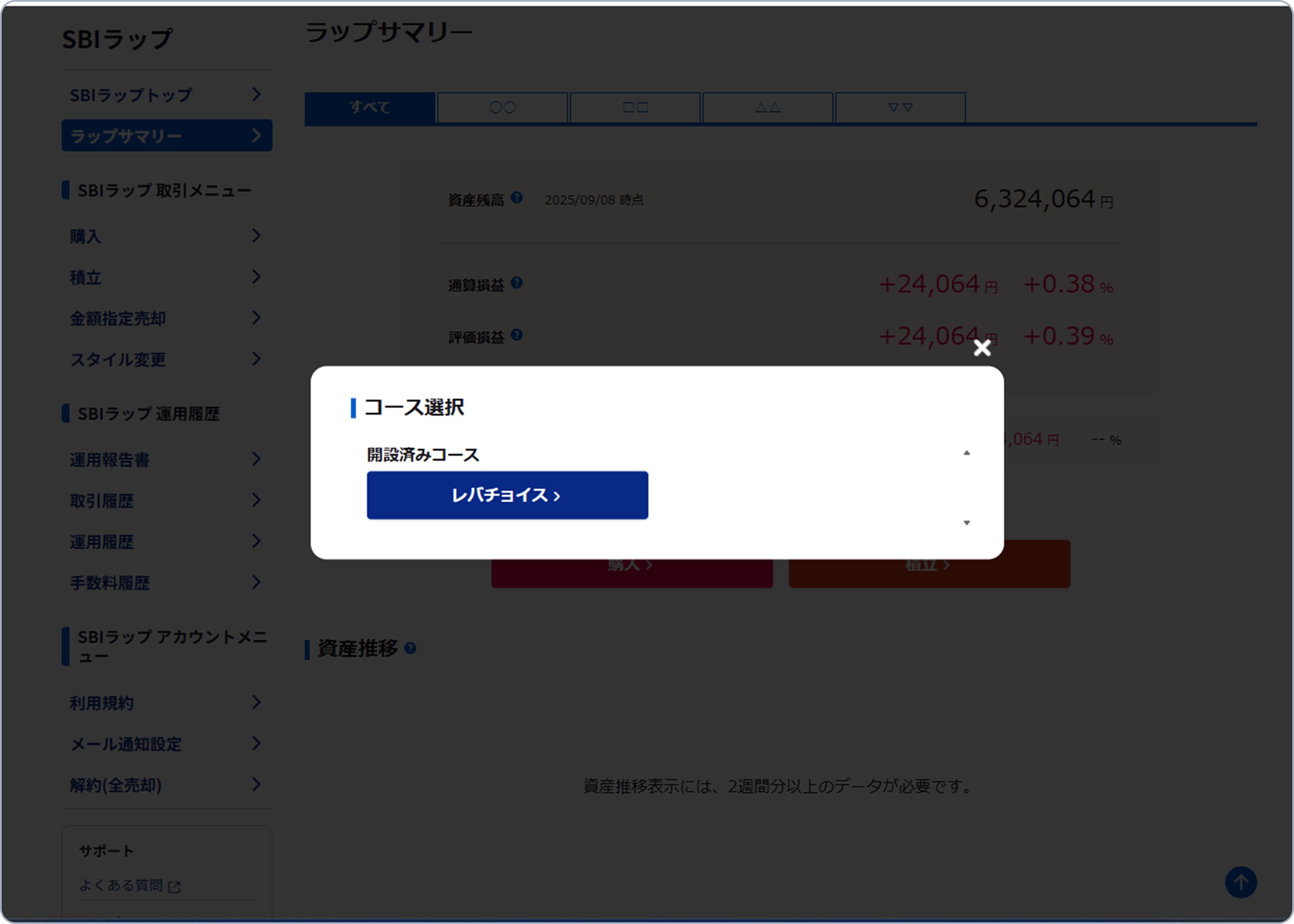 「ラップサマリー」画面にあるメニューの「解約(全売却)>」ボタンから、コース選択画面を開き、申し込みたいコースを選択して解約(全売却)画面へ移動してください。